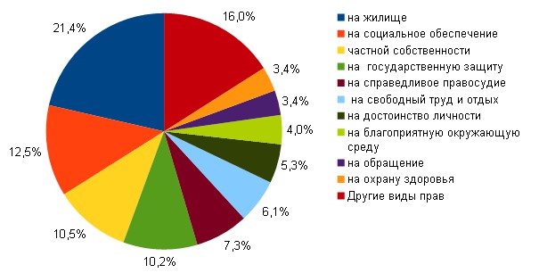 По сравнению с предыдущим годом структура нарушений отдельных прав изменилась, что соответствует динамике по группам прав. Так, в 2013 г. произошло существенное снижение доли обращений о нарушении прав на социальное обеспечение, на свободный труд и отдых, на образование, на благоприятную окружающую среду. Одновременно выросло количество обращений по нарушениям прав на государственную и судебную защиту, на обращение в государственные и муниципальные органы, на достоинство личности.