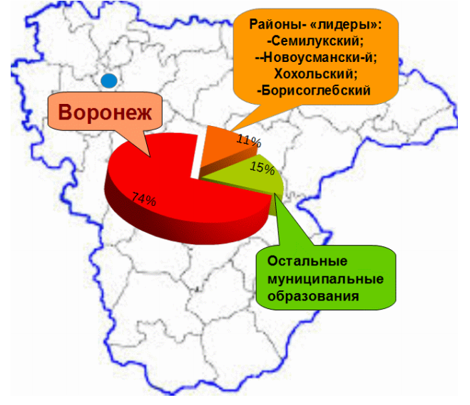 В 2018 году еще более выросла (до 74 %) доля жалоб жителей города Воронежа. Четверку «лидеров» по количеству обращений (11 %) среди остальных муниципальных образований области составляют: Семилукский район (52 обращения); Новоусманский район (40); Хохольский район (26); Борисоглебский район (26). На все остальные муниципальные образования приходится только 15 % обращений.