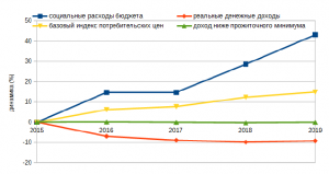 Реальные денежные доходы населения впервые выросли на 0,6% после трехлетнего падения, реальная заработная плата выросла, но динамика ее роста замедлилась (с 8,6% до 2,3%). Доля людей с доходами ниже прожиточного минимума осталась практически на прошлогоднем уровне (-0,1%). Потребительские цены продолжили рост. Однако прирост базового индекса потребительских цен в 2019 году замедлился (2,6% по сравнению с 4,6% в 2018 г.) за счет небольшого увеличения стоимости продовольственных товаров (1,1%). А стоимость минимального набора продуктов питания даже снизилась на 0,9% (в 2018 г. был рост на 10,5 %).