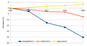 ● По демографическим индикаторам (рис.12) в 2019 году продолжилось устойчивое отставание от плановых значений и углубление негативной тенденции расхождения уровней смертности и рождаемости. Естественная убыль населения в 2019 году увеличилась на (в 2018 – 5,9 %) за счет ускорения процесса снижения рождаемости на 8,6 % несмотря на положительную динамику снижения смертности 4 % (к 0,5 % в 2018 г.). Ожидаемое по итогам 2019 года (пока официально не подтвержденное) значение средней продолжительности жизни – 74 года (в 2018 г. – 73,2 года).