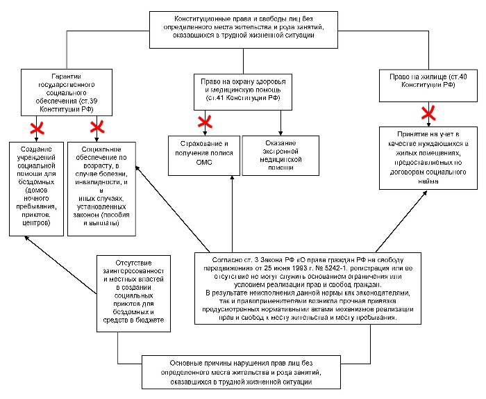 Регистрация или ее отсутствие не могут служить основанием ограничения или условием реализации прав и свобод граждан2. В результате неисполнения данной нормы законодателями и правоприменителями возникла прочная привязка предусмотренных нормативными актами механизмов реализации прав и свобод к месту жительства и/или месту пребывания. А бездомные, как правило, не имеют ни места жительства (регистрации), ни документов, удостоверяющих личность.