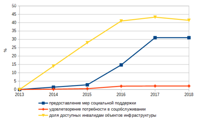 - доля доступных инвалидам объектов инфраструктуры несколько снизилась - до 58,4 % (в связи с уменьшением финансирования госпрограммы).
