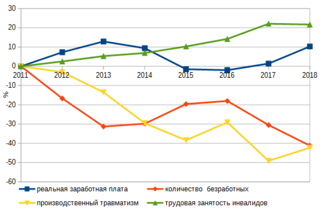 Динамика индикаторов Стратегии, характеризующих уровень реализации права на труд за период 2012-2018 годы приведена на диаграмме (рис.19). В 2018 году продолжились положительные изменения: рост (с некоторым ускорением) реальной заработной платы и трудовой занятости инвалидов; снижение количества безработных. Статистические данные по наиболее существенным показателям сферы трудовых отношений, в том числе, результатам выполнения областной программы «Содействие занятости населения» и плана реализации Стратегии в 2018 году приведены в Приложении (Примеры 22-23). В целом программа и план были выполнены. Финансирование программы составило в 2018 году 952,8 млн рублей (в 2017 г. - 982,4 млн рублей, в 2016 г. - 1085,3 млн руб.). В целом динамика индикаторов Стратегии и других показателей соответствует снижению количества жалоб Уполномоченному в сфере трудовых прав.