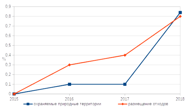 - доля особо охраняемых природных территорий выросла по отношению к значению в 2017 г. на 0,74 % и достигла 4,09 % (целевое значение - 3,45 %);