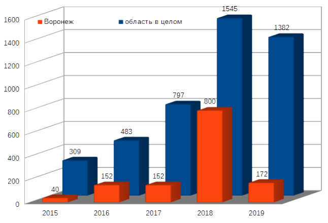 Администрациями муниципальных районов и городских округов ежеквартально издавались правовые акты об утверждении перечней земельных участков для предоставления многодетным гражданам и предоставлялись в департамент имущественных и земельных отношений (ДИЗО). По результатам мониторинга наличия земельных массивов на территории муниципальных образований области для возможного предоставления в собственность многодетным гражданам по области было сформировано 1382 участков, из них на территории городского округа город Воронеж 172. Динамика этого показателя за 5 лет приведена в Примере 64 и на рисунке 25. К сожалению, тренд его роста в 2019 году прервался.