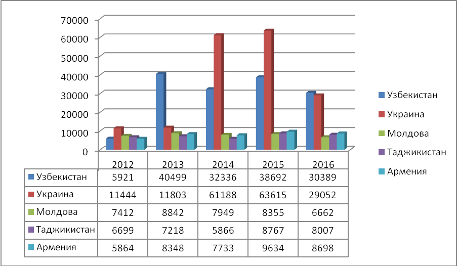 Среди мигрантов, поставленных на учет в 2016 году, преобладали граждане Узбекистана (27,6 %) и Украины (27,5 %). Из диаграммы распределения гражданской принадлежности мигрантов, поставленных на учет в 2012—2016 гг. (рис. 33) видно, что удельный вес среди них граждан Украины в 2016 году снизился практически в 2 раза по отношению к 2014 и 2015 годам.