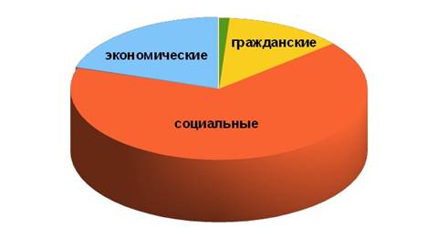 Анализ динамики нарушенных прав по группам (см. табл.1, рис.1) показывает превышение удельного веса нарушений прав в социальной и гражданской сферах – над нарушениями в экономической сфере.